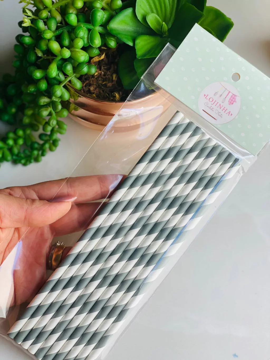 Canudos de Papel Listrado - Cinza e Branco