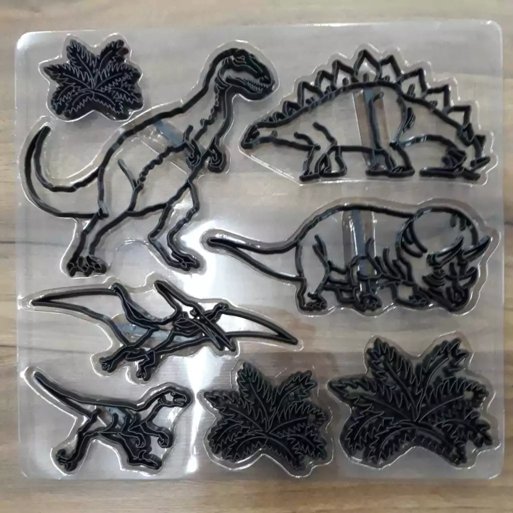 5 dinossauros diferentes e 3 plantas (folhas de coqueiros)