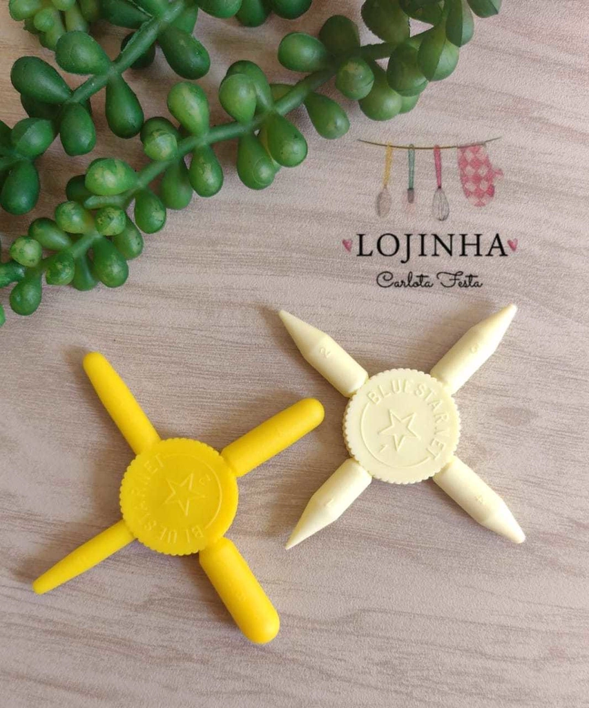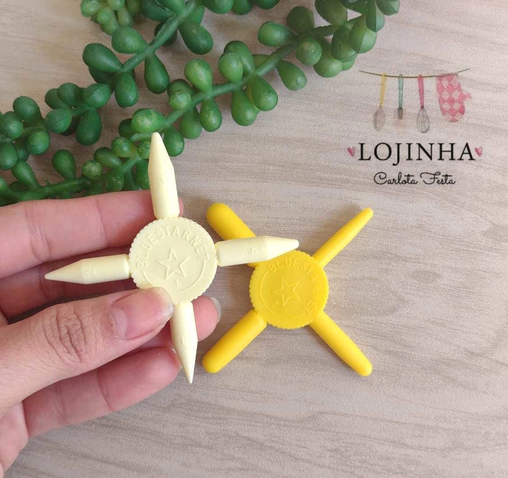 Pinta Bolinha proporciona firmeza às mãos na hora marcar peças de biscuit ou doces com acabamento em pasta americana. São dois utensílios, cada um com quatro possibilidades de marcações diferentes.